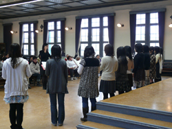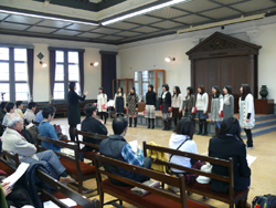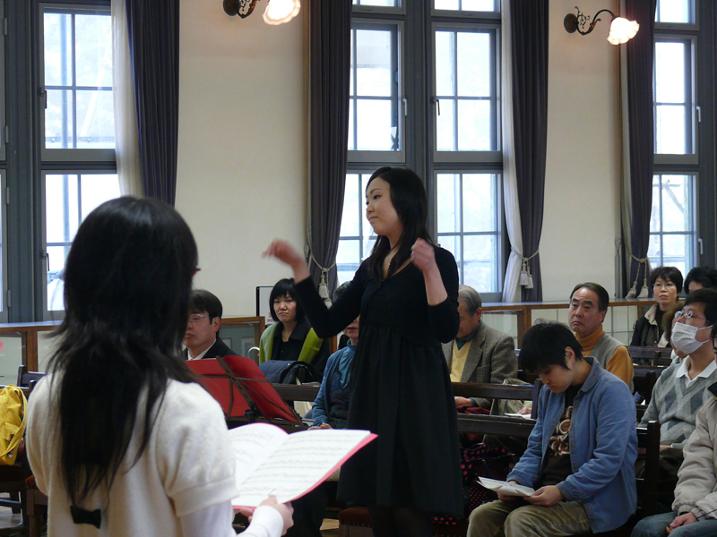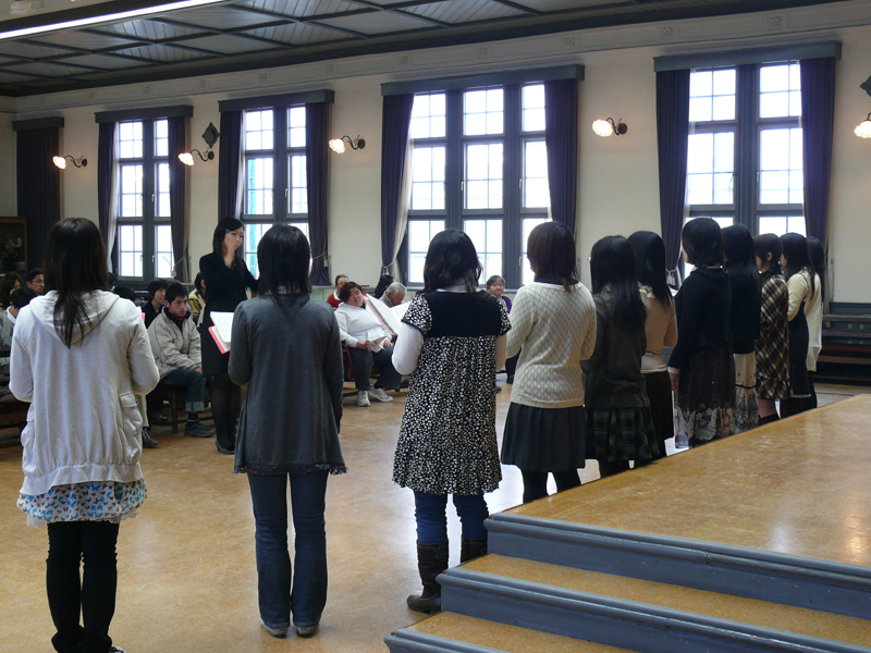 2月度は、本学学生サークル「音楽部」のハーモニーを聴かせていただきました。記念館に美しく響く女性ボーカルの声にとてもすがすがしい気持ちがしました。 当日配布いたしました歌詞のなかで「汽車ぽっぽ」は「兵隊さんの汽車(作詞:富原薫 /作曲:草川信)」が昭和20年に改作されたものがコンサートで使用されました。また「夕焼け小焼け」はランチタイムコンサート事務局の手違いで「赤とんぼ」の歌詞を配布いたしました。2曲ともに会場で口ずさみたいと思われたご来客の方々には大変ご迷惑をおかけいたしました。ここに謹んでお詫び申し上げます。