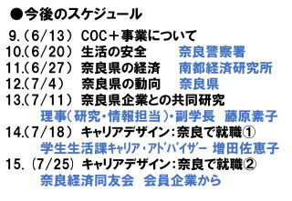 今後のスケジュールは、奈良警察署、南都経済研究所、奈良県、奈良経済同友会会員企業等から、「奈良県の経済」、「奈良県の動向」、「奈良で就職」といったテーマでの授業展開を予定しています。