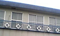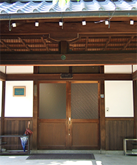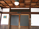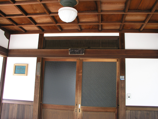車寄せの天井は格天井で、アールヌーボー調のシーリングライトがつけられています。玄関引き戸や表札は創建当時のままのものです。また玄関入り口上部の繊細な欄間(らんま)も特徴のひとつです。