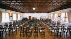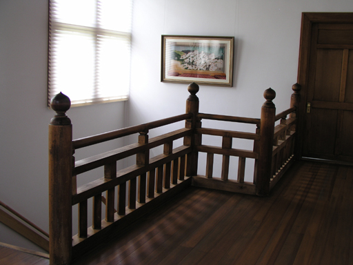 玄関ホールの左手階段を登りはじめると、1階のやや重い雰囲気とはうって変わり、吹き抜け空間に作られた窓から入る光によって明るく開放的な趣となります。吹き抜け廊下の手すりには神社や寺院にみられる伝統的な建築物の装飾である擬宝珠が付けられており、モダンな中にもクラシックな雰囲気を漂わせています。木製ドアを開けると、200uの大ホールが目の前に広がります。大ホールの天井は折上(おりあげ)格天井です。折上げは周囲の壁と天井の間を支輪(しりん)という曲げ木でカーブをとりながら立ち上げ、天井を高くする形で格調の高いものです。改修前には、南北に並ぶ窓は上げ下げ窓でしたが、復元が難しくすべて押し開き窓とし、上部の窓はハンドルで操作するようにしました。床は二重床にして、保温が考慮されています。照明は壁に取り付けたもの、天井から吊るしたものとも当時のものです。改修では、明るさ確保のためダウンライトが増設され、非常用ライトも取り付けられました。大ホールに隣接した西側の洋室は、当初の優美であるが清楚な雰囲気をそのまま残して、照明器具(当時のまま)、カーテン、壁紙の模様など全体が調和のとれた心地よい空間になるよう配慮されています。
