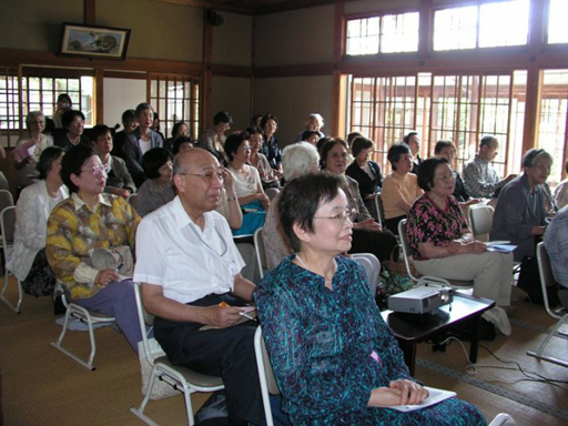 コンピューターグラフィックによる往時の平等院の再現、勝川春亭筆の江戸時代中期の平等院の絵図など映像を駆使して話を進めてくださった。鳳凰堂の中心線は北に7度ぶれているが、夏至から冬至に至る太陽の動きを考え、堂内に入り込む光線を計算に入れて建てられているとのこと。庭園の発掘により、池の州浜を復元したところ、風が吹いた時の池の波の立ち方が違った等、古人の知恵のすばらしさを解き明かして下さった。