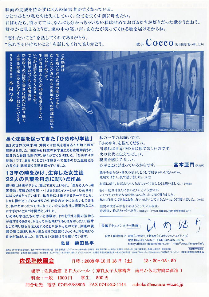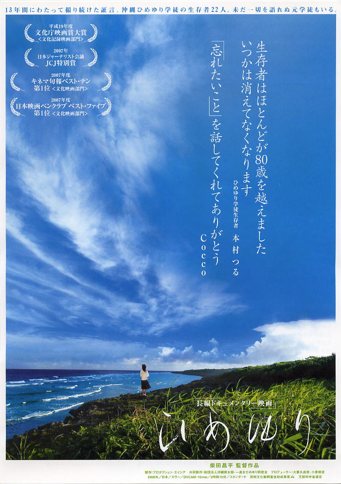 柴田昌平監督が13年の歳月をかけ、沖縄ひめゆり学徒の生存者の言葉を丹念に紡いだ「長編ドキュメンタリー映画」です。文化庁映画賞はじめ数多くの賞を獲得した話題の作品です。