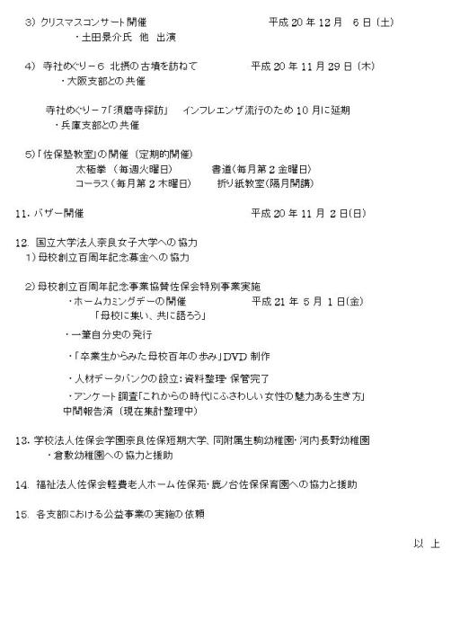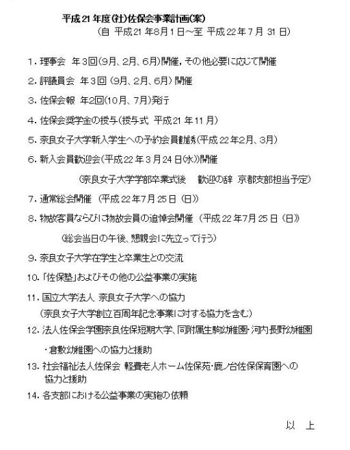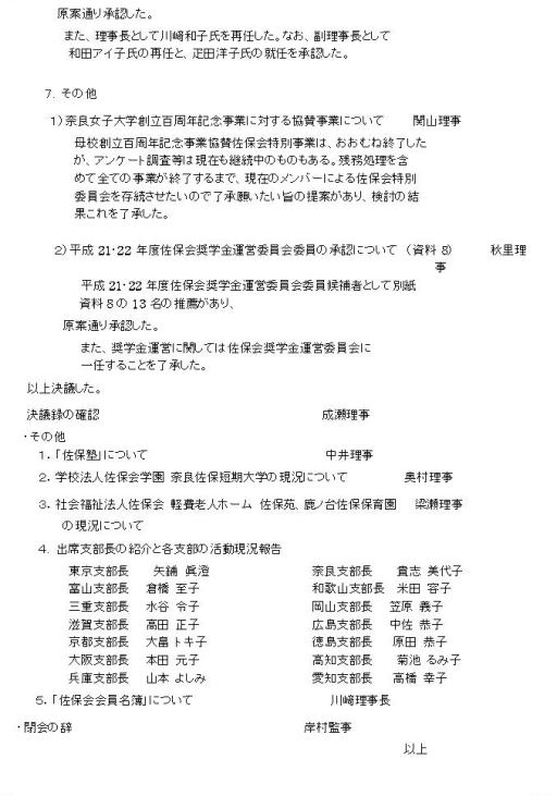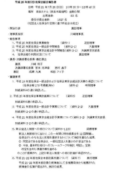 平成20年度佐保会総会・追悼会・懇親会開催 日時 平成21年7月26日(日) 会場 奈良ホテル(奈良市高畑町) Tel 0742-26-3300 ・総会 (金剛の間) 10時30分〜12時30分 ・追悼会 (大和の間) 13時00分 〜 ・懇親会 (大和の間) 13時15分〜16時00分 ・講演 「“高分子”って!?」 講師 奈良女子大学理学部教授 岩 井 薫 先生 平成20年度社団法人佐保会総会報告 平成20年度社団法人佐保会事業報告 平成21年度社団法人佐保会事業計画 当日の風景