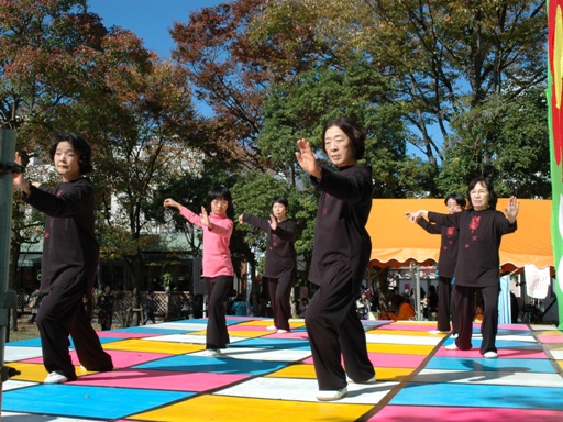 11月3日、前夜の雨も上った秋空の下、紅葉に彩られたキャンパスに設置された中央ステージに佐保会員と地域の方々の混成部隊が月組、星組に分かれ登壇し、簡化24式太極拳を演舞しました。太極拳を習い始めて、日も浅く緊張の中での演舞でしたが、無事初歩段階をクリアしました。皆さんの真剣な面持ちが写真の中に見られます。