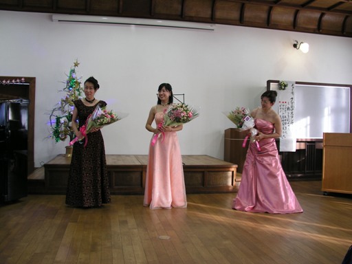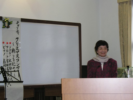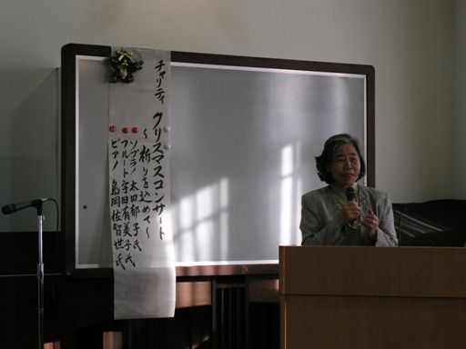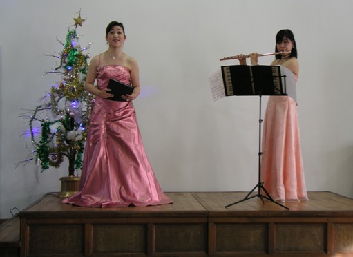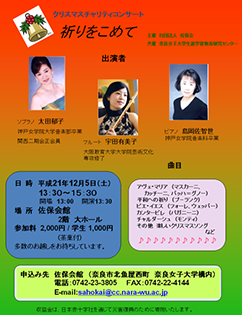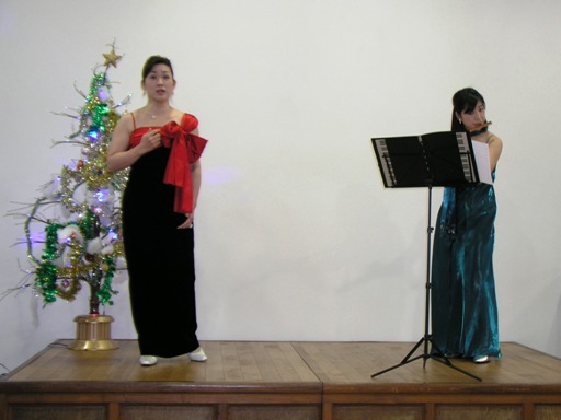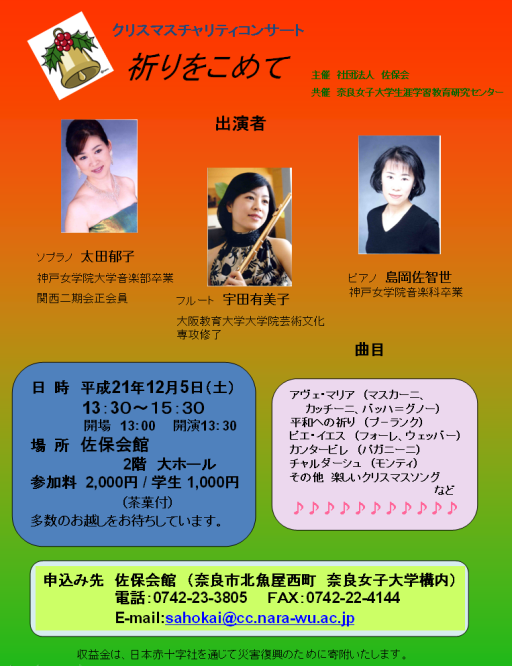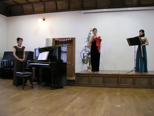 2009年12月5日(土)午後、ソプラノ太田郁子さん、フルート宇田有美子さん、ピアノ島岡佐智世さんによるクリスマステャリティコンサートが、佐保会館の二階大ホールで行われました。曲目はマスカーニ、カッチーニ、バッハ=グノーのアベマリア、フォーレ、ウエッバーのピエ・イエス、プーランクの平和への祈りやクリスマスソングなど、もうすぐクリスマスを迎えるこの時期にふさわしい選曲でした。心を洗われるような美しい歌声、フルートの音色、ピアノの響きが今も心地よい余韻として残っています。アーティストの皆様、そして寒い中、会場にお越し下さった皆様ありがとうございました。