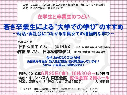 平成22年6月25日、佐保会と奈良女子大学との共催による在学生と卒業生の集いが佐保会2階大ホールで行われました。