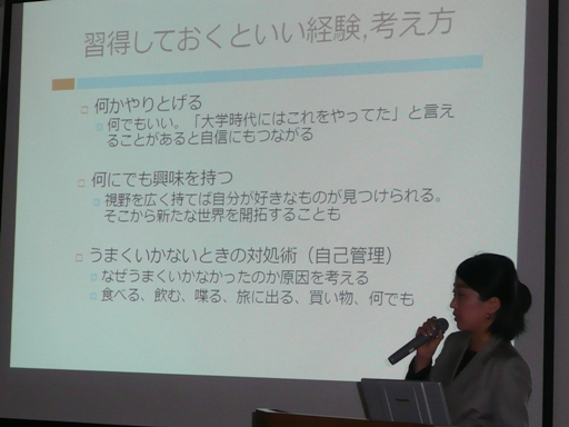 自分の研究テーマを専門外の人に説明できますか。知っていることと、理解して活かすことは違う。知識ではなく、智恵を大事に。何でもいい。「大学時代にはこれをやっていた。」と言えることがあると自信にもつながる。何でも興味を持ち、自分の好きなことを見つけよう。学生時代の友達は一生のもの。思いっきり奈良女生活を楽しんでください。