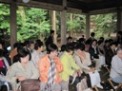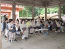 参加者55名が揃ってまず日吉大社西本宮にて正式参拝の儀。神職の修祓・祝詞奏上に続く川崎理事長の玉串奉奠により佐保会の弥栄と全員の健康を祈願したあと隣接の宇佐宮拝殿に移り、馬淵直樹宮司様のご講話を拝聴しました。旧白毫院庭園を眺めながらの昼食は、石積みを模した三段重ねのお弁当で、湖国の味を堪能させて頂きました。