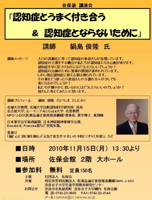 佐保塾講演会「認知症とうまくつき合う&認知症とならないために」を開催しました。 講 師:鍋島俊隆先生、名城大学教授、名城大学比較認知科学研究所所長 日 時:2010年11月15日(月曜日)13:30より 会 場:佐保会館 2階大ホール 共 催:奈良女子大学 生涯学習教育研究センター 参加費:無料 定員150名