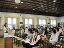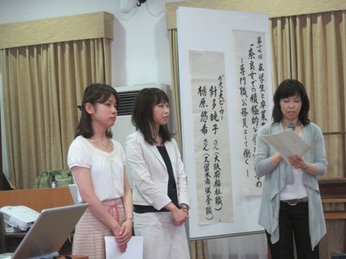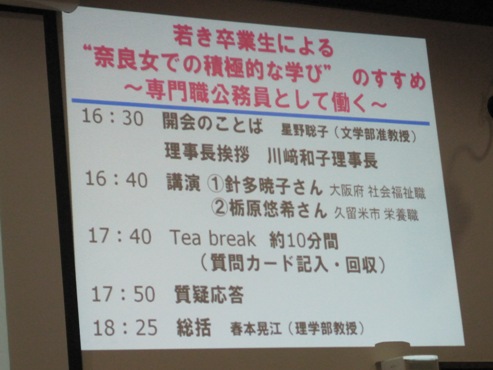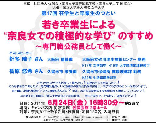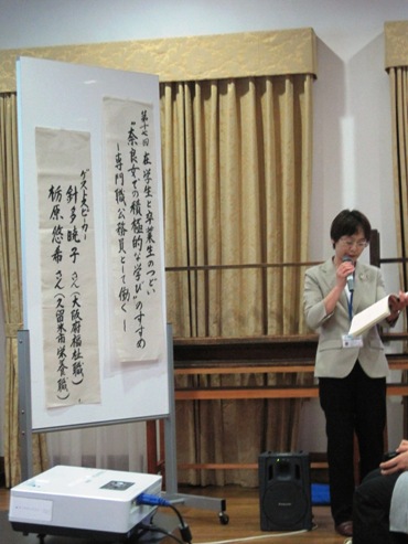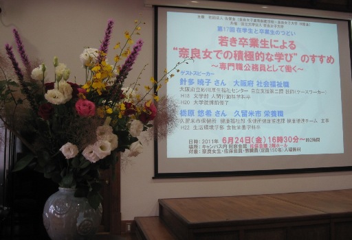 2011年6月24日(金)に佐保会と奈良女子大学との共催で「在学生と卒業生の集い」が佐保会館2階ホールで開かれました。ゲストスピーカーは現役の学生に最も近い年齢の、「専門職公務員として働く」というご自分の夢を実現した方々であるだけに、「社会に活かせる積極的な学びのヒント」を頂こうと、大学の講義終了の4時半から学生さん達が次々と訪れ、就活への関心の高さと自分らしい学びの姿勢を模索する真摯さが窺われました。