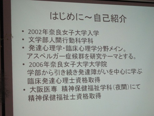 大阪府福祉職の針多暁子さん 大阪府立砂川厚生福祉センター勤務(H19年大学院博前修了)は、文学部人間行動科学科で発達心理学・臨床心理学分野をメインにアスペルガ―症候群を研究テーマとして、大学院でも発達障がいを中心に学び、臨床発達心理士資格取得。同時に大阪医専の精神保健福祉学科(夜間)へと所謂ダブルスクールに通い、精神保健福祉士資格取得。ご自身の専門と生涯の仕事を一致する道を実現するべく、積極的に学んでこられた熱意と弛まぬ努力、行