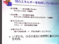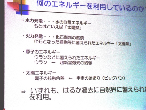 まず原子力発電で使用される燃料のウラン原子核からどうしてあのような莫大なエネルギー(熱)が取り出せるのかについて、基本的に原子核内の核子(陽子や中性子)の結合力が非常に強くて化学結合の10万から100万倍もあり、ウラン235原子核では熱中性子吸収による核分裂の連鎖反応が起こるためであり、また原子力発電所の事故によって放出された放射性物質(主としてβ線とγ線を、たまにα線を放出する)が人体に及ぼす影響について、放射性物質は細胞レベルで誘起された種々の化学変化を通じて人体に影響を与える、たとえば細胞分裂の阻害とか遺伝的変異など、種々具体的に分かりやすくお話をして下さいました。
