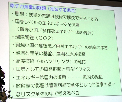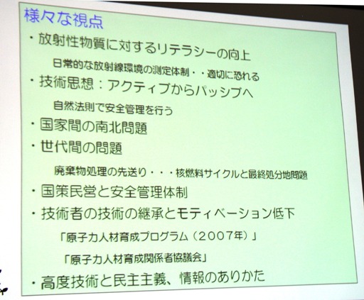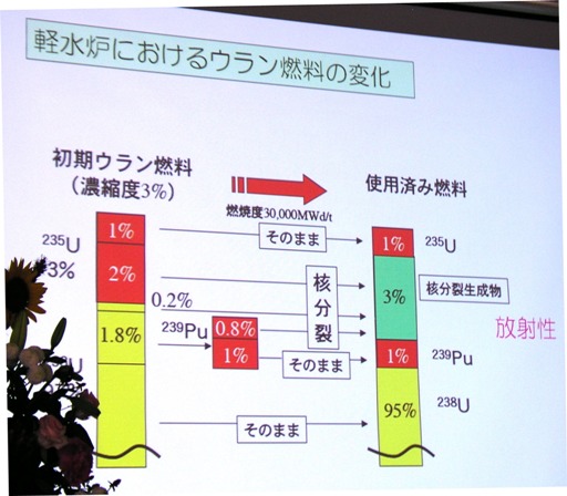 最後に原子力発電所から出る使用済核燃料の処理についてのお話がありました。使用済核燃料は再処理工場でウラン・プルトニウムと高・低レベル放射性廃棄物に分離されるが、高レベル放射性廃棄物と人間との付き合いは非常に長い年月(一万年以上という人もいる)にわたるであろうという話は強く印象に残りました。日本には青森県六カ所村に使用済核燃料の再処理工場がありますが、まだ殆ど稼動していないようです。