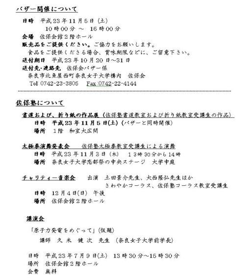 ・平成23年度バザー、佐保塾、講演会について