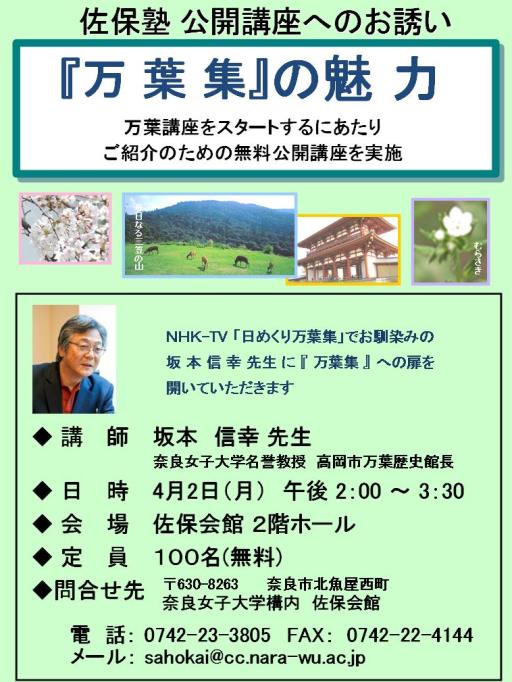 このたび佐保塾定期教室に、4月から万葉講座が新たにスタートします。講座紹介を兼ねて、下記のように無料公開講座を実施して、講師の坂本先生に、万葉集の持つ不思議な魅力を、映像を交えつつ語ってもらい、万葉びとの世界へと誘っていただくことにしました。