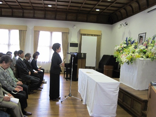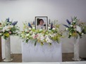 佐保会館二階大ホールには季節の花々に囲まれた清しい遺影が飾られ、大