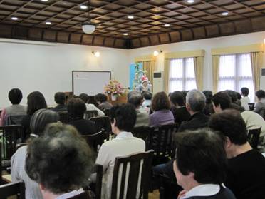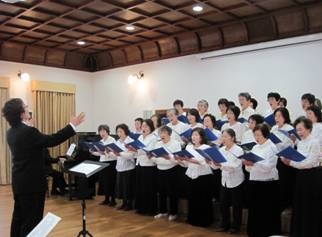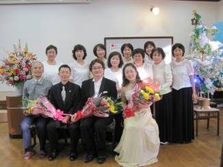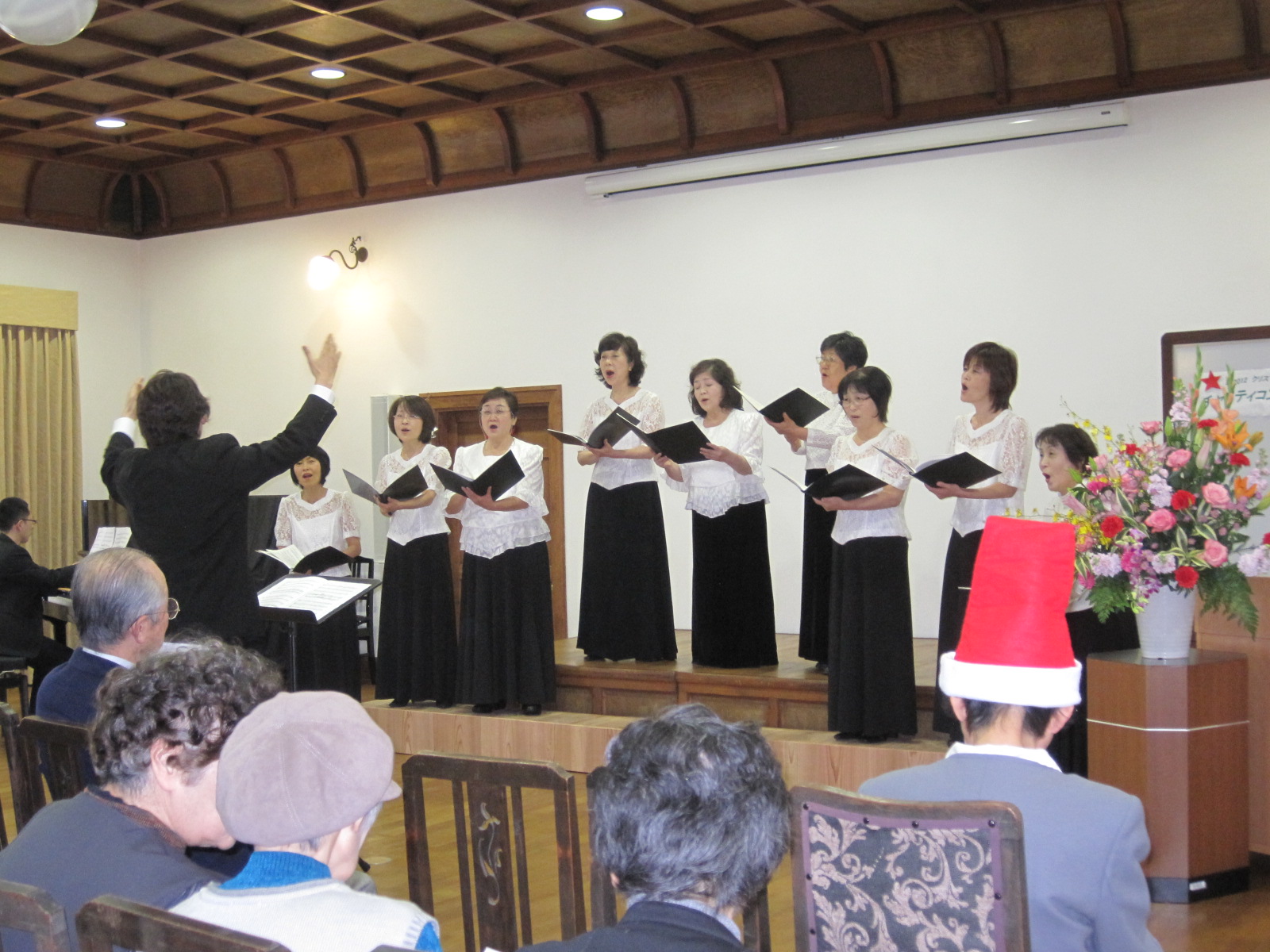 テイータイムの後、第2部は、土田氏と三村さんの二重唱でサルトリの「君と旅立とう」が歌われ、会場は魅了された。続いて、佐保塾コーラスにより「ドナ ノービス パーチェム」や「時の旅人」など数曲披露され、締め括りはテノール・ソプラノ・デュエットのクリスマスソング「神の御子は」「ノウエル」を聞いた後、土田氏の歌唱指導でクリスマスソングの大合唱でした。