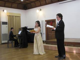 毎月第2木曜日、佐保塾コーラスをご指導していただいている土田景介氏を中心に、氏の個人指導を受ける「さわやかコーラス」による「サウンド・オブ・ミュージック」「アヴェマリア」「Stand Alone」で始まり、ついで、同じく指導を受ける山口順司さんのバリトンで「ひばり」「さすらい人」が披露された。さらに、伴奏者である山本泰大氏によるピアノソロ、ショパンの「ノクターン第2番 作品9−2」、モーツアルト・リスト編曲「アヴェ・ヴェルム・コルプス」が演奏され、クリスマスらしい華やかさに包まれました。関西二期会会員の三村浩美さんのソプラノソロでオペラ「ジャンニ スキッキ」より「私の大好きなお父さん」、「せりビアの理髪師」より「今の歌声は」を、惚れ惚れする高く美しい響きで歌われ、土田氏のテノールソロ、トスティの「アディオ」、トスカより「星はひかりぬ」で第一部は佳境のうちに終わりました。