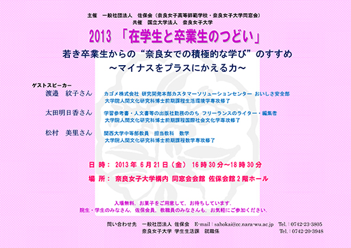 今年の「在学生と卒業生のつどい」は、若き卒業生から“奈良女での積極的な学び”のすすめ 〜マイナスをプラスにかえる力〜 というテーマのもとに、6月21日(金)に以下の方達に語っていただきました。