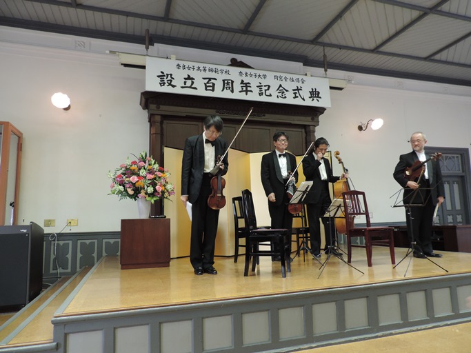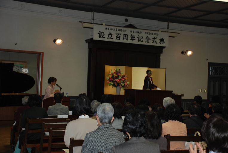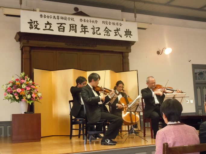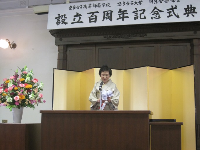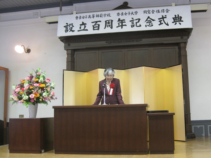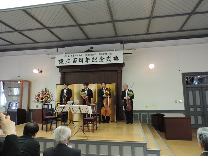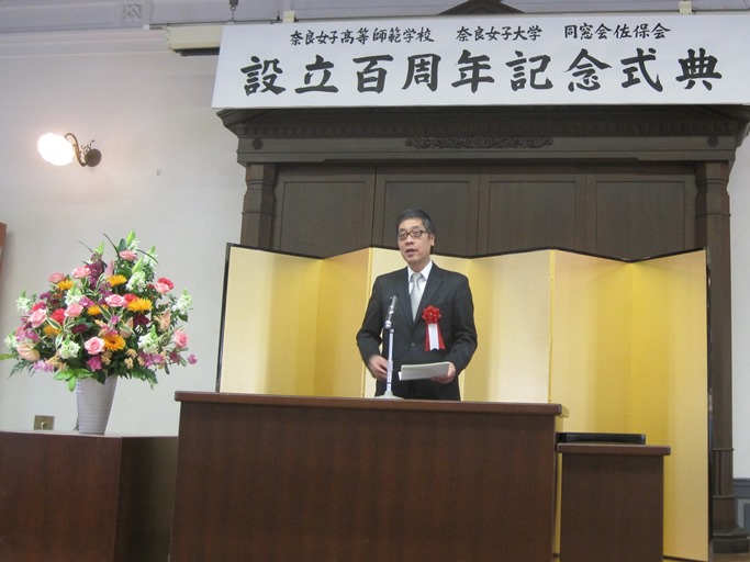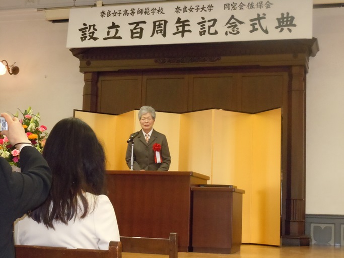 佐保会設立百周年記念式典・祝賀会 アルバム 平成26年3月29日(土)佐保会百周年記念式典・祝賀会を催しました 午前の部 式典 於 奈良女子大学記念館(旧講堂)午前10時30分〜 式典前 式次第 奈良女子高等師範学校校歌斉唱 第一部 開会の辞 黙祷 司会 門村幸夜氏 (理生卒) 疋田洋子氏 佐保会理事長式辞 来賓祝辞 今岡春樹氏 奈良女子大学学長 荒井正吾(奈良県知事)代 松村佳子氏 奈良県教育委員 (理物卒) 来賓紹介 支部長紹介 卒業生代表のことば 奥村晶子氏 (理化卒) 百周年記念事業の報告 松尾欣枝氏 (理物卒) 祝電披露 第二部 弦楽四重奏 マイハート弦楽四重奏団 ★第1ヴァイオリン 辻井 淳 ★ヴィオラ 沖田 孝司 ★第2ヴァイオリン 釋 伸司 ★チェロ 雨田 一孝 式典が終わって 午後の部 祝賀会 司会進行 宮本志津香氏 (文幼卒) 於 大学会館2階 大会議室 昼 食 午後1時30分〜 祝賀音楽会 午後2時〜 第一部:★佐保塾コーラス ★テノール・ソロ 土田景介 ★ピアノ・ソロ 山本泰大 第二部:みんなで歌おう・お祝いの歌 宴が終わって 奈良女子大学メールマガジン440号でもご覧いただけます。 当日のプログラム 詳しくはこちら(pdf)