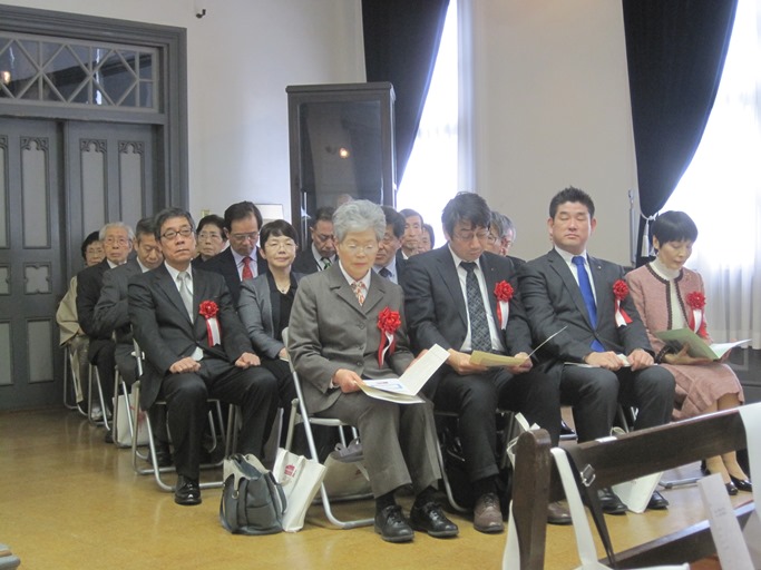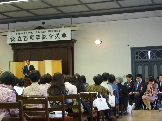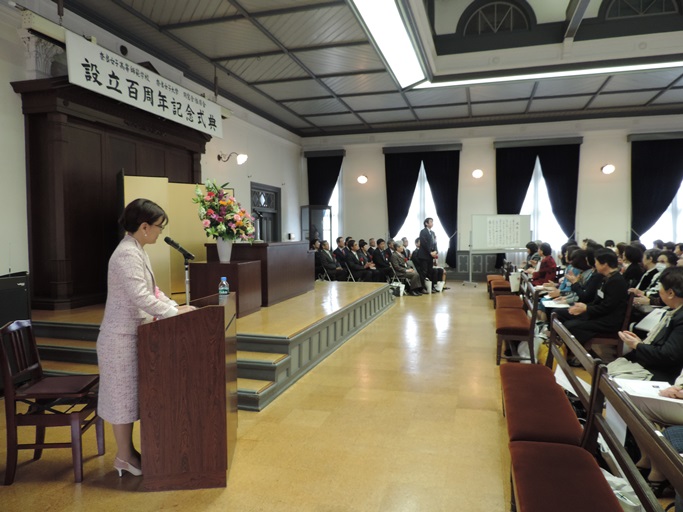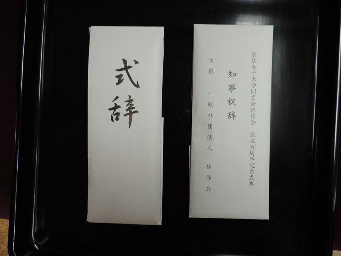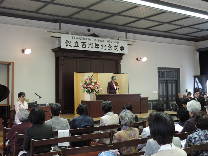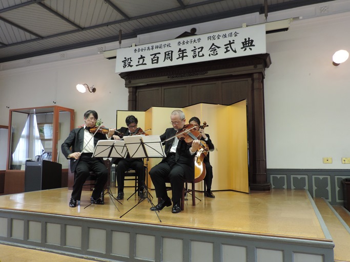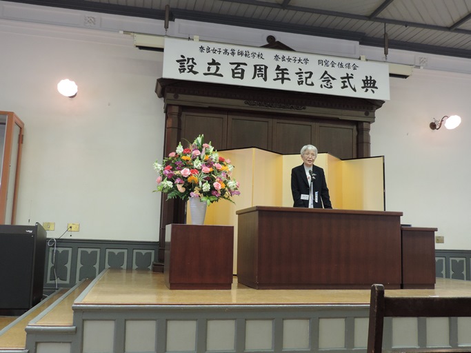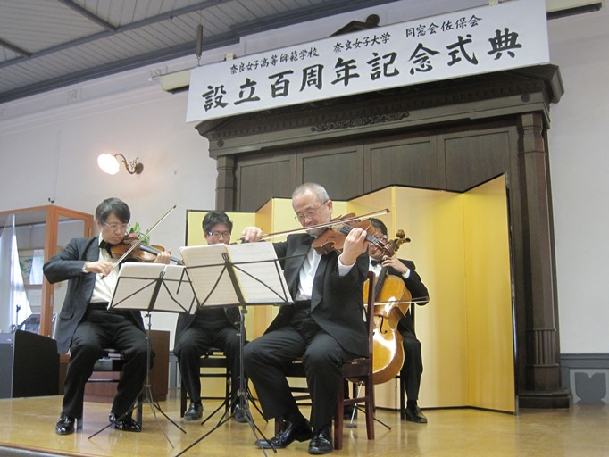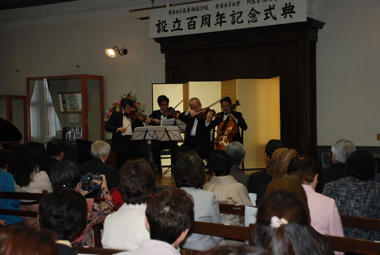 佐保会設立百周年記念式典・祝賀会 アルバム 平成26年3月29日(土)佐保会百周年記念式典・祝賀会を催しました 午前の部 式典 於 奈良女子大学記念館(旧講堂)午前10時30分〜 式典前 式次第 奈良女子高等師範学校校歌斉唱 第一部 開会の辞 黙祷 司会 門村幸夜氏 (理生卒) 疋田洋子氏 佐保会理事長式辞 来賓祝辞 今岡春樹氏 奈良女子大学学長 荒井正吾(奈良県知事)代 松村佳子氏 奈良県教育委員 (理物卒) 来賓紹介 支部長紹介 卒業生代表のことば 奥村晶子氏 (理化卒) 百周年記念事業の報告 松尾欣枝氏 (理物卒) 祝電披露 第二部 弦楽四重奏 マイハート弦楽四重奏団 ★第1ヴァイオリン 辻井 淳 ★ヴィオラ 沖田 孝司 ★第2ヴァイオリン 釋 伸司 ★チェロ 雨田 一孝 式典が終わって 午後の部 祝賀会 司会進行 宮本志津香氏 (文幼卒) 於 大学会館2階 大会議室 昼 食 午後1時30分〜 祝賀音楽会 午後2時〜 第一部:★佐保塾コーラス ★テノール・ソロ 土田景介 ★ピアノ・ソロ 山本泰大 第二部:みんなで歌おう・お祝いの歌 宴が終わって 奈良女子大学メールマガジン440号でもご覧いただけます。 当日のプログラム 詳しくはこちら(pdf)