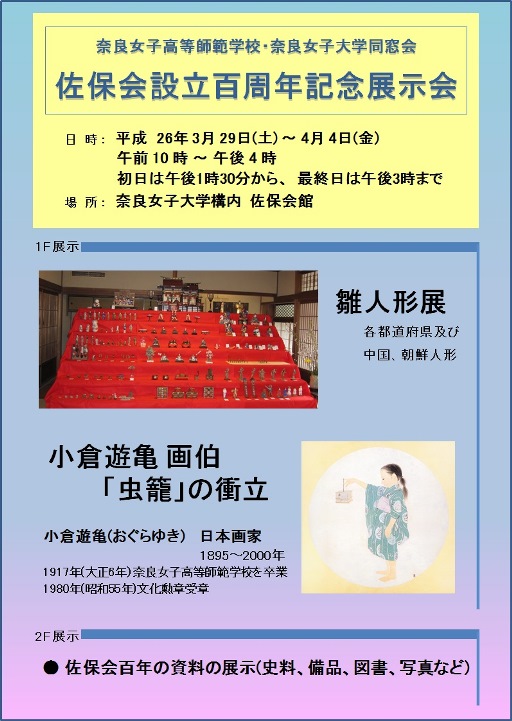 佐保会設立百周年記念展示会 アルバム 記念展示会 於 佐保会館 平成26年3月29日〜4月4日 1階 人形展 雛人形に加え各都道府県の郷土人形 衝立 「虫籠」 小倉遊亀 画伯 2階 展示 史料、備品、図書、写真など ポスター
