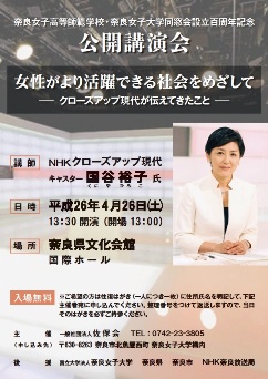 平成26年4月26日(土)午後1時30分から、奈良県文化会館国際ホールにおいて、佐保会設立百周年記念講演会が催されました。NHKクローズアップ現代キャスターの国谷裕子氏をお迎えし、「女性がより活躍できる社会をめざして〜クローズアップ現代が伝えてきたこと〜」と題して講演していただきました。この日は、新緑のすがすがしい少し汗ばむ日でした。ホールの会場は満席で、全国各地から参加した佐保会員はもとより一般市民を含む多くの方々が講演に聴き入りました。
