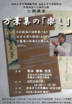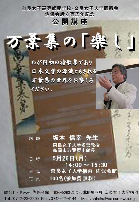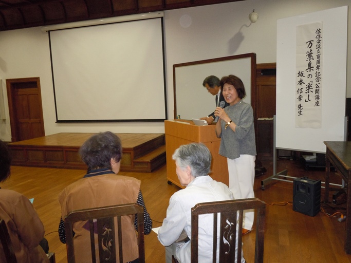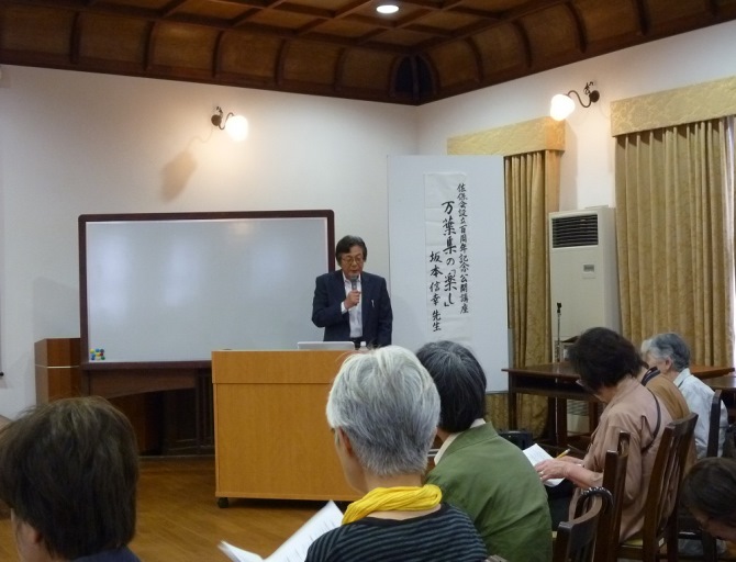 佐保会設立百周年記念公開講座として、佐保塾定期教室万葉講座の講師 坂本信幸先生にご講演いただきました。この日は、梅雨の気配を感じる一日でしたが、東海・近畿各地から百名近くの会員および一般市民の方々がお越しくださいました。