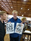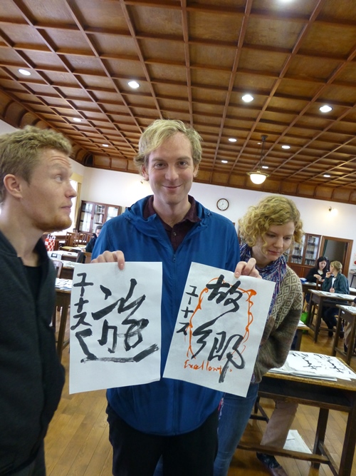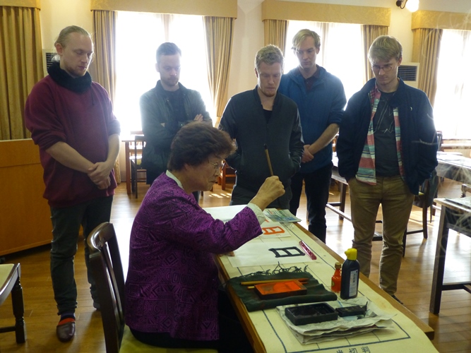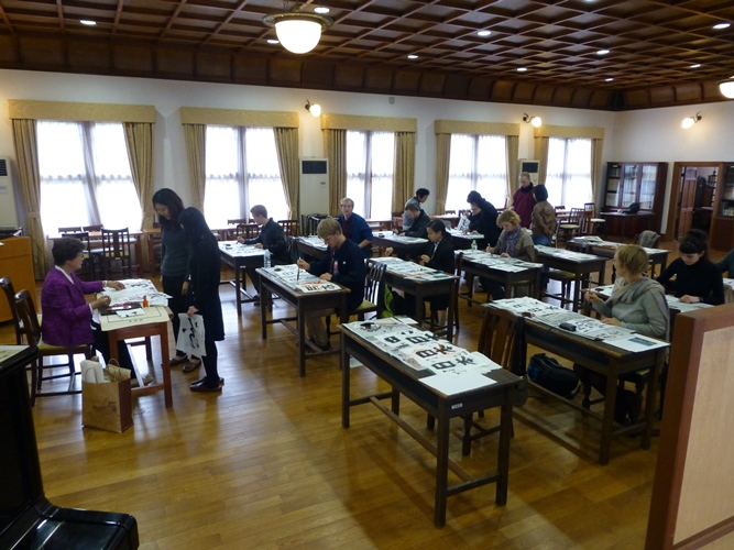 講師川口塘紅先生の指導で書道の体験をしました。書道教室の受講生は外国の若い学生との交流