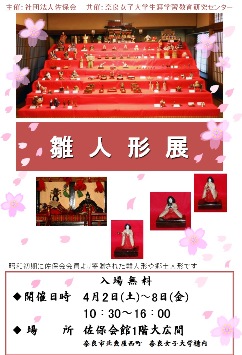 平成28年 佐保会所蔵 雛人形・郷土人形展 一般社団法人 佐保会所蔵 「雛人形展」を開催しました 開催日時:平成28年4月2日〜4月8日 10:30〜16:00 開催場所:佐保会館一階大広間 昭和初期に全国の佐保会員から寄贈された雛人形および郷土人形をご披露しました。 今年は、高取土佐街道「町家の雛めぐり」へ出展した雛と郷土人形を展覧しました。 入学式を終えた新入生とそのご家族がたくさん来館され、佐保会館のたたずまいと そこに飾られた雛たちを興味深そうにご覧になっていました。 ひな飾り風景 当日のポスター