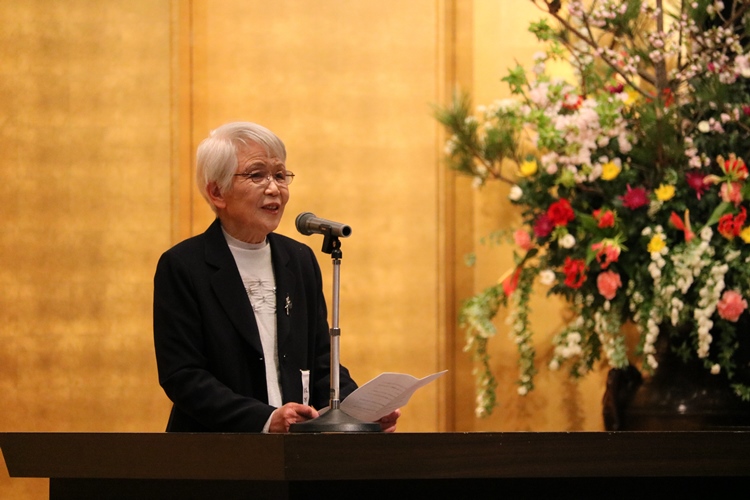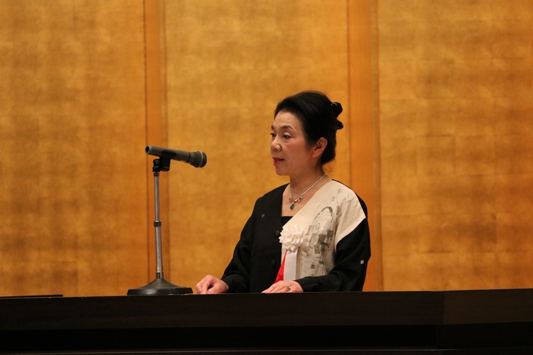 松尾欣枝理事長は、講堂の緞帳「爛漫」の原画を制作した先輩 小倉遊亀画伯の言葉を紹介し、緞帳