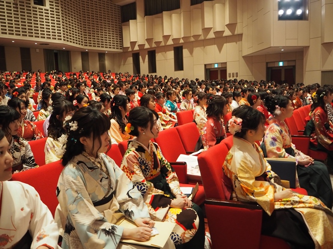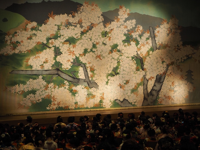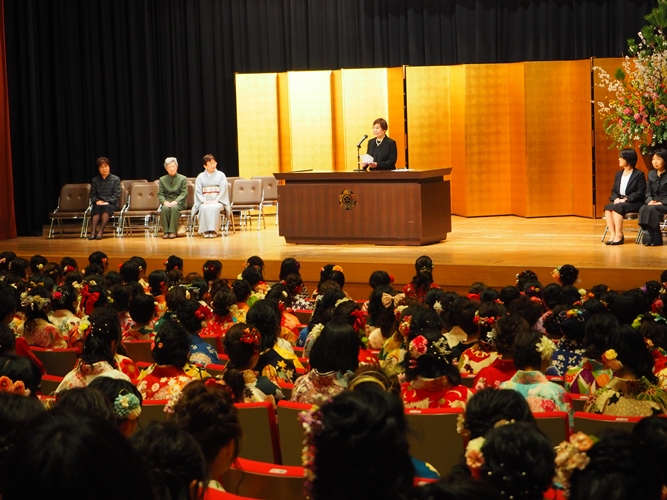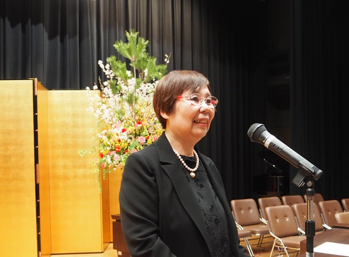 高津副理事長は、講堂に掲げられた緞帳の原画、小倉遊亀画伯(佐保会員、1917年卒)の「爛漫」に描かれた「画面いっぱいに大きく枝を広げた桜」に想いをよせ、その幹を大学に、根を同窓会佐保会に、今にも花開かせようとしているつぼみを卒業生に見立て、「花開き、実を結び、そして冷たい風にさらされたとき、大学や同窓会をたずねてほしい」と祝意を示し、はなむけに小倉遊亀氏の次の言葉を贈りました。「満身の力を出し切ってする仕事ほど美しいものはありません」