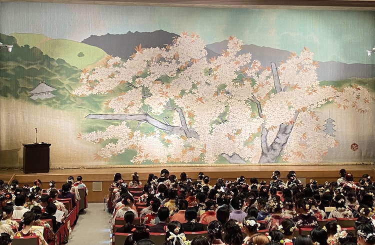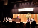 会場となった講堂は花が咲きほこったかのような華やぎと喜びに満ち溢れ、緞帳 「爛漫」(原画:小倉遊亀画伯、佐保会員)に描かれた桜までもが卒業生の門出を祝っているようでした。