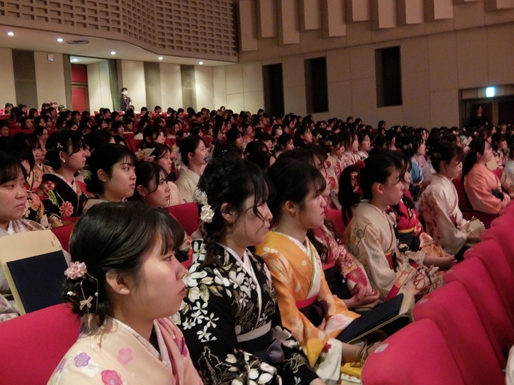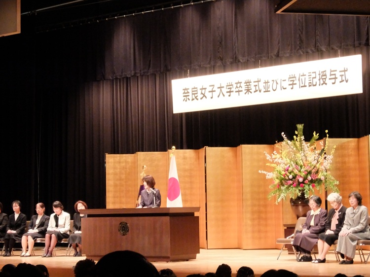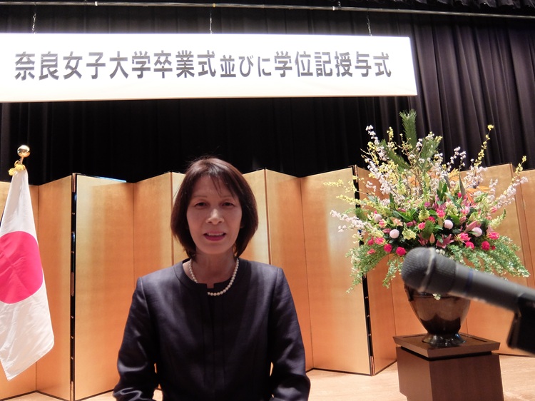 野口理事長は、同窓会佐保会の創立110周年記念として昨年発刊した会員240余名の自分史などを編纂した冊子「一筆自分史U」の紹介を通して、全都道府県に支部をもつ佐保会のすばらしさ、奈良女子大学卒業生の強い絆について述べ、初々しい同窓生の新たな門出に祝意を表しました。