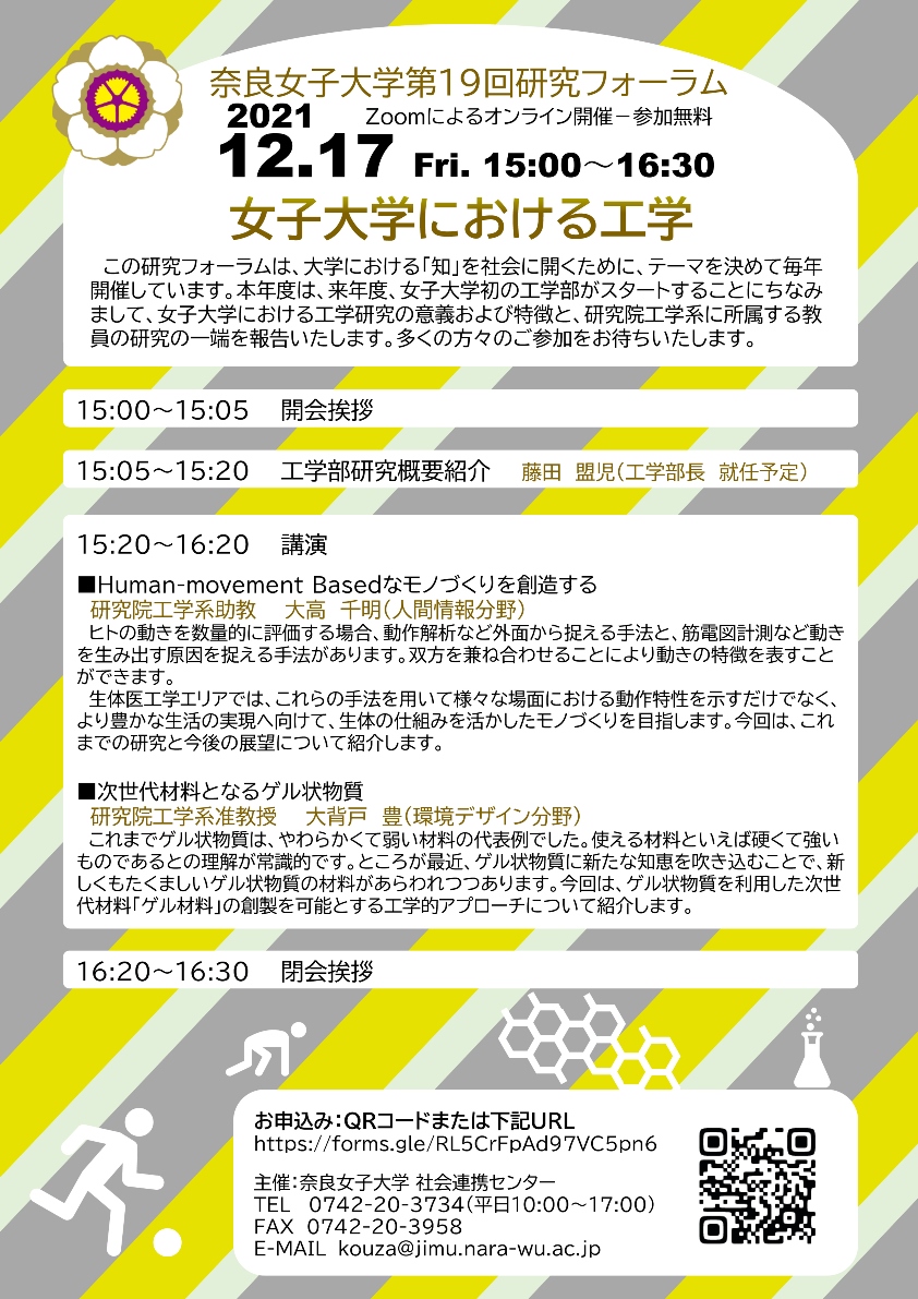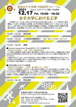 この研究フォーラムは、大学における「知」を社会に開くために、テーマを決めて毎年開催しています。本年度は、来年度、女子大学初の工学部がスタートすることにちなみまして、女子大学における工学研究の意義および特徴と、研究院工学系に所属する教員の研究の一端を報告いたします。 | |