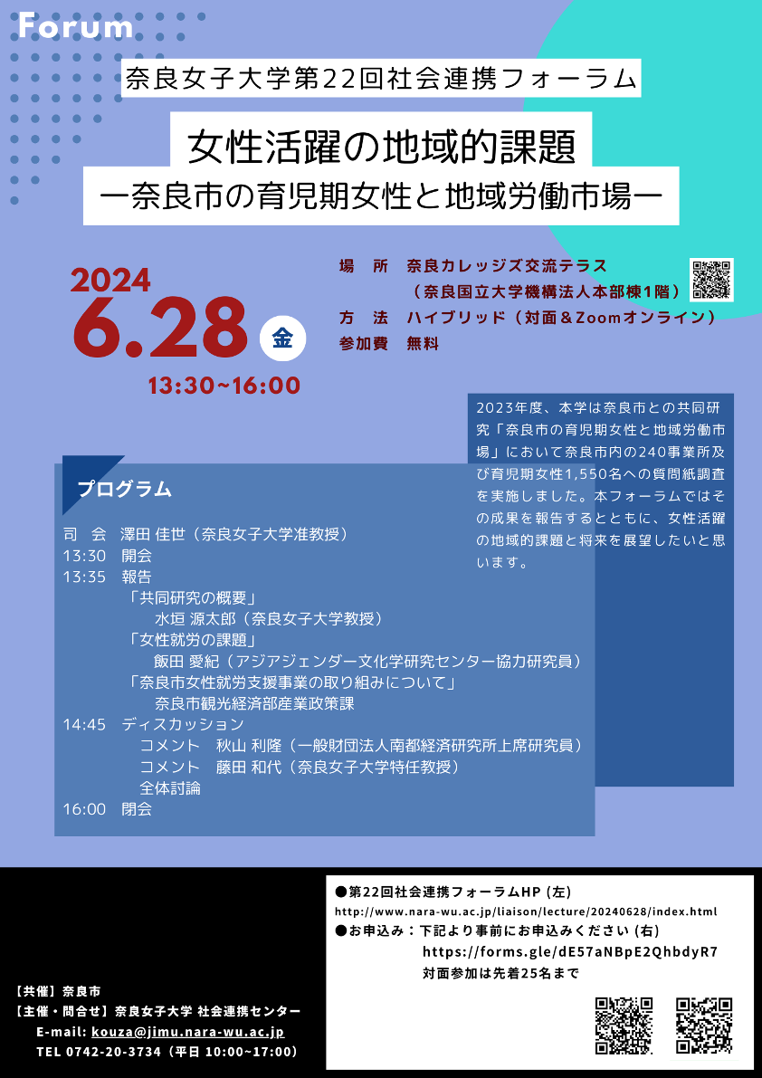2023年度、本学は奈良市との共同研究「奈良市の育児期女性と地域労働市場」として、奈良市内の240事業所及び育児期女性1550名への質問紙調査を実施しました。このフォーラムではその成果を報告するとともに、女性活躍の地域的課題と将来を展望したいと思います。