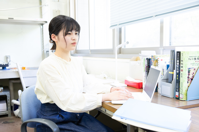 卒業研究以来、「統合失調症の症状緩和に寄与できる食品の栄養成分」をテーマとしたマウス実験による研究に従事しています。マウスに機能性成分を摂取させ、ヒトの統合失調症に相当する症状の変化をモニターし、データを統計学的に解析します。きわめて地道で基礎的な研究ですが、この研究が発展していけば、薬物療法や心理社会的療法を支持する食事的アプローチ法の開発につながり、心の病に苦しむ人たちのお役に立てると考え、やりがいを感じています。現在は新たに「タンパク質の結晶構造解析」の研究に取り組み始めました。大学院には、ヒトの健康を研究するための高度な機器および技術が整えられており、多角的に研究できるのが魅力です。